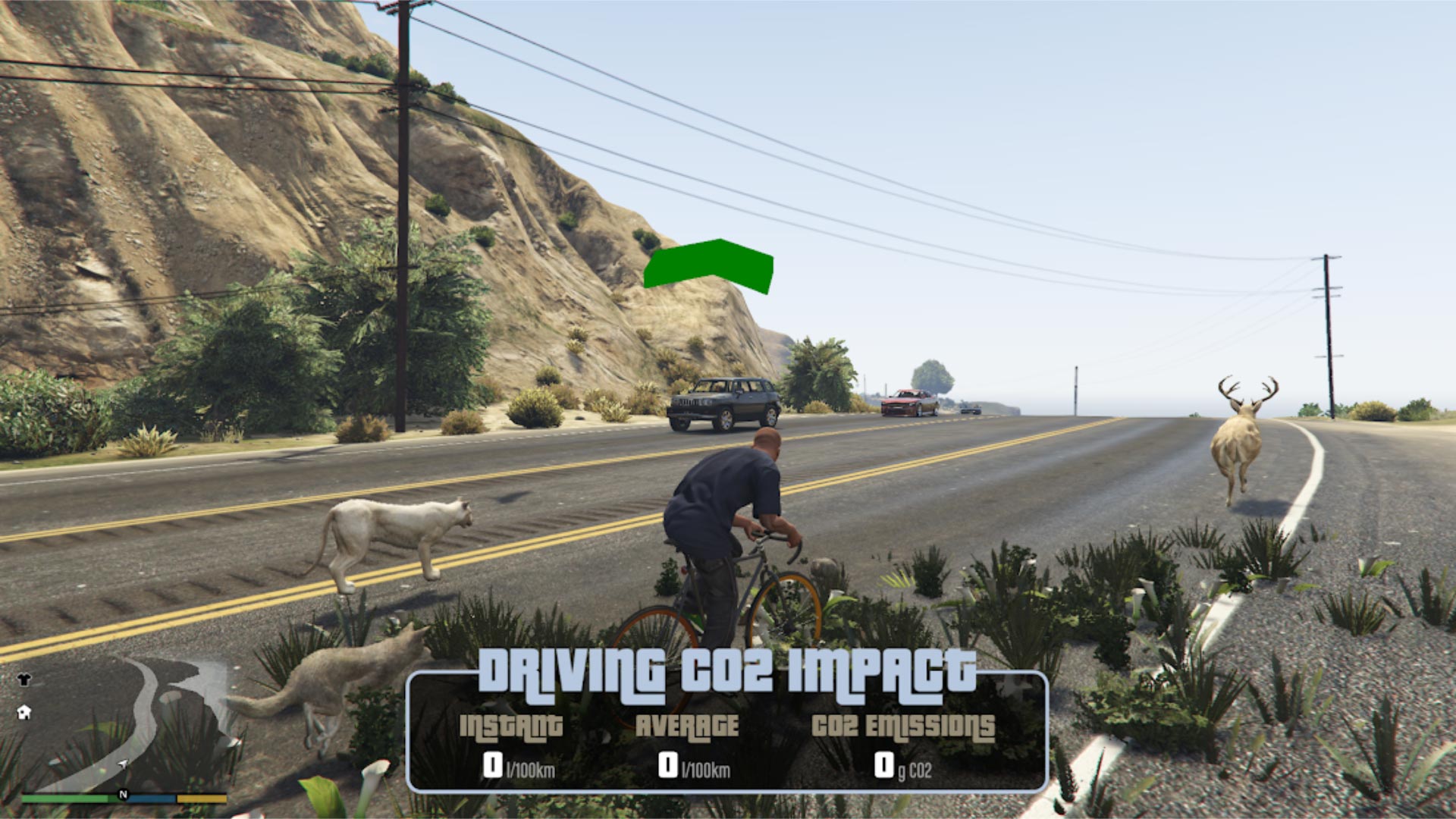 Develop a mod that makes GTA V educational, so that people can better understand carbon emissions as they cruise around Los Santos racing, heisting and killing.